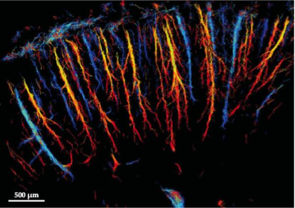 圖1. 鼠腦皮質血管的超分辨率超聲圖像。顏色代表血流速度:深藍和淺藍部分展現了朝著頭骨方向(向著圖片頂端)流動的血液,紅色和黃色部分則展現了離開頭骨方向的血流。(米克爾·坦特供圖)