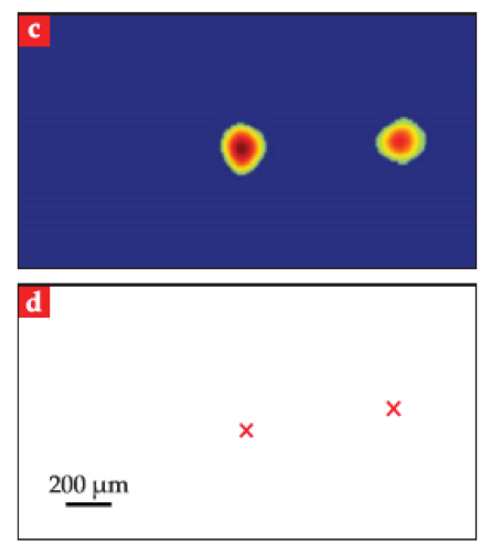 坦特和同事從一開始就采取了一種全然不同的策略:他們利用超快超聲以每秒500幀的速度對鼠腦進行成像,并檢查連續圖像之間的差異。在幀與幀之間的較短時間里,大部分的影像區域幾乎沒什么變化,因此每次圖像的貢獻可以互相抵消。但明顯移動或破裂的氣泡會顯示為波長量級的斑塊。這樣,研究者們就可以對這些斑塊的分布進行高斯擬合(如圖2所示),并定位其中心——即氣泡所在位置。通過重疊2.5分鐘內拍攝的數千張不同圖像的氣泡位置,他們獲得了老鼠血管的高分辨率合成圖像。因為能夠追蹤單個氣泡在不同圖像上的變化,因此他們也可以推斷出每根血管中的血流速度,如圖1中彩色部分所示。
